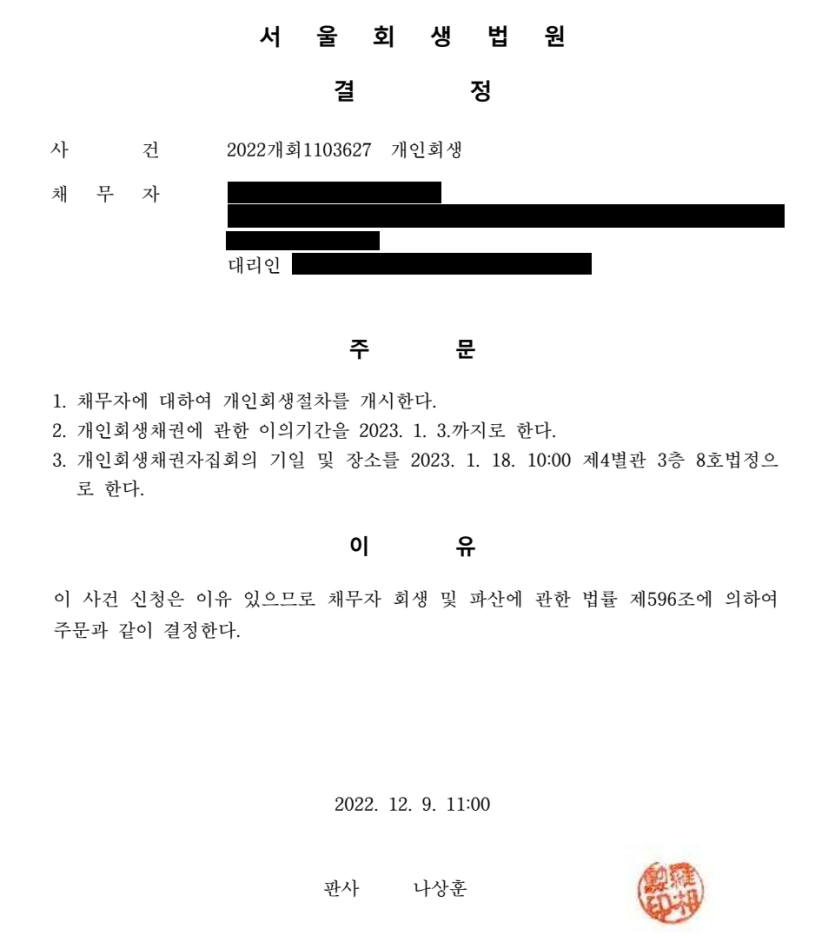 서울회생법원2022개회1103627 생활비 및 돌려막기