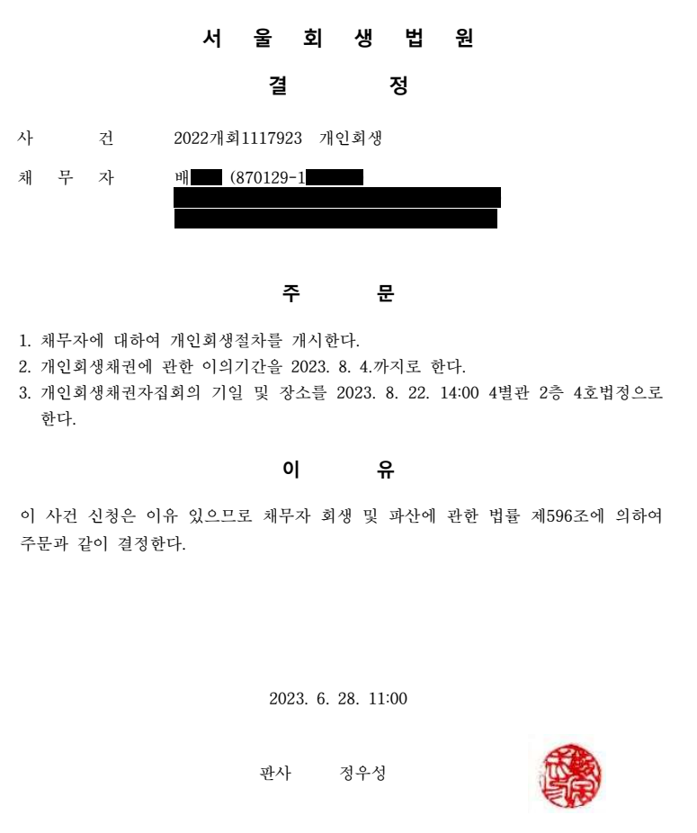 서울회생법원2022개회1117923 사업실패 및 생활비