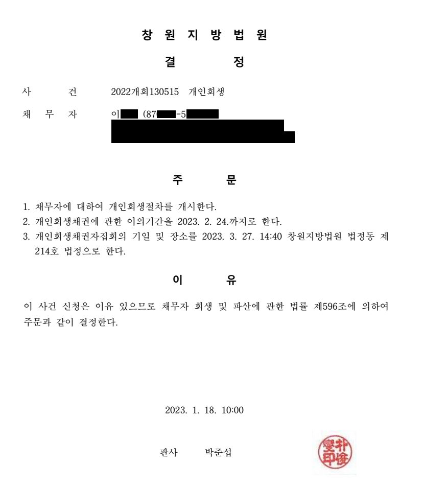 그랬기 때문에 신청 후 3개월안에 개시결정을 받게 되었습니다.(창원지방법원은 결정이 상당히 느립니다. 보통 6개월 이상 걸립니다.)
