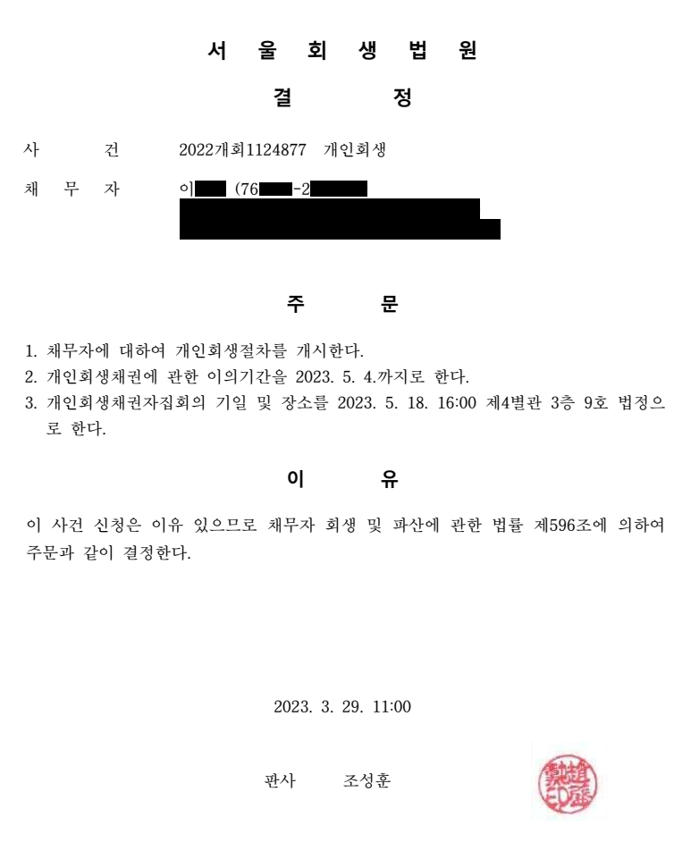 서울회생법원2022개회1124877 생활비 및 사업부진