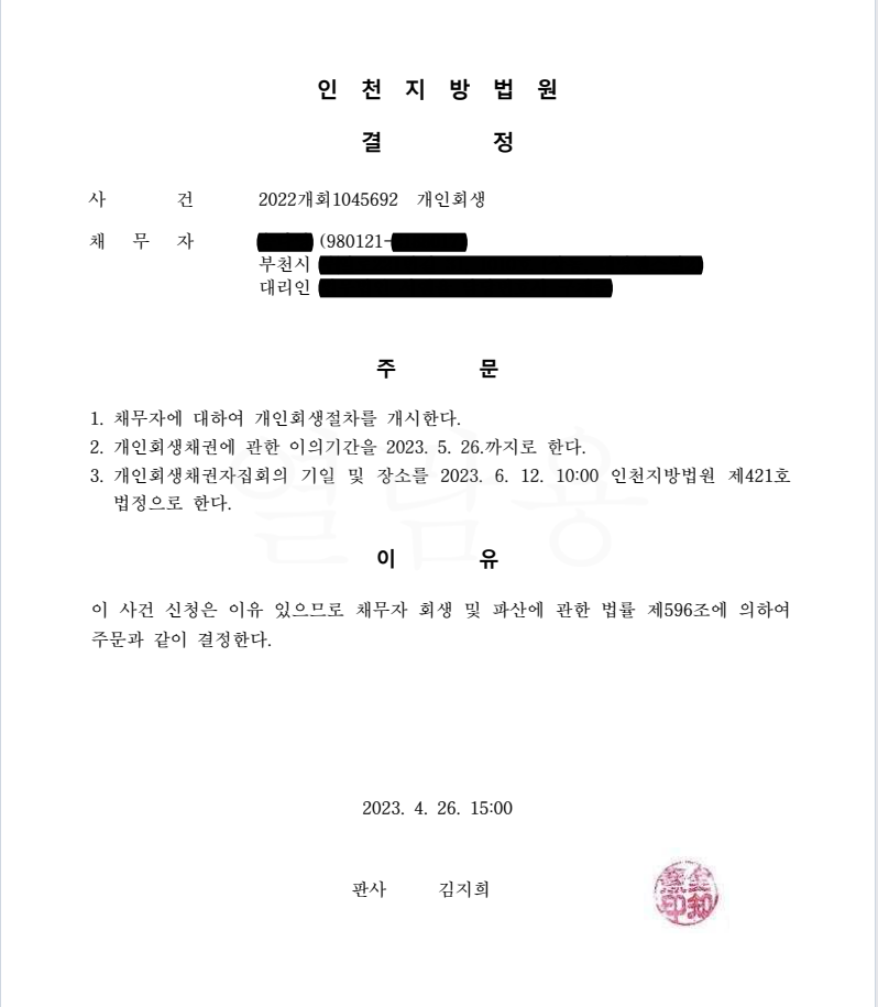 인천지방법원2024개회1046650, 사업실패 및 불법작업대출