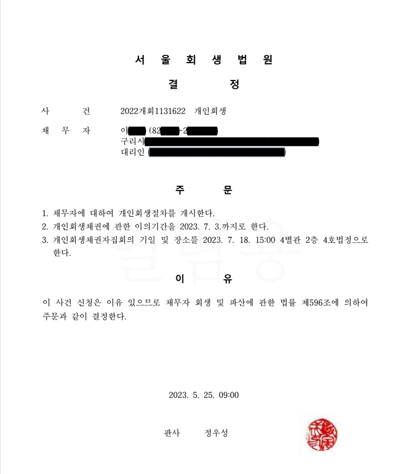 이 분이 살고계시는 지역이 구리여서 원래는 의정부지방법원으로 신청해야 했으나 직장이 서울이어서 서울회생법원으로 신청할 수 있었던게 정말 행운이었습니다.