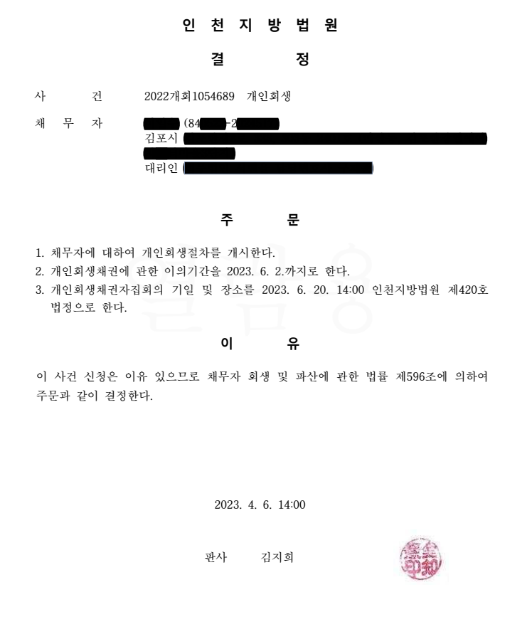 비고 : 이전에 워크아웃 진행, 배우자도 회생신청